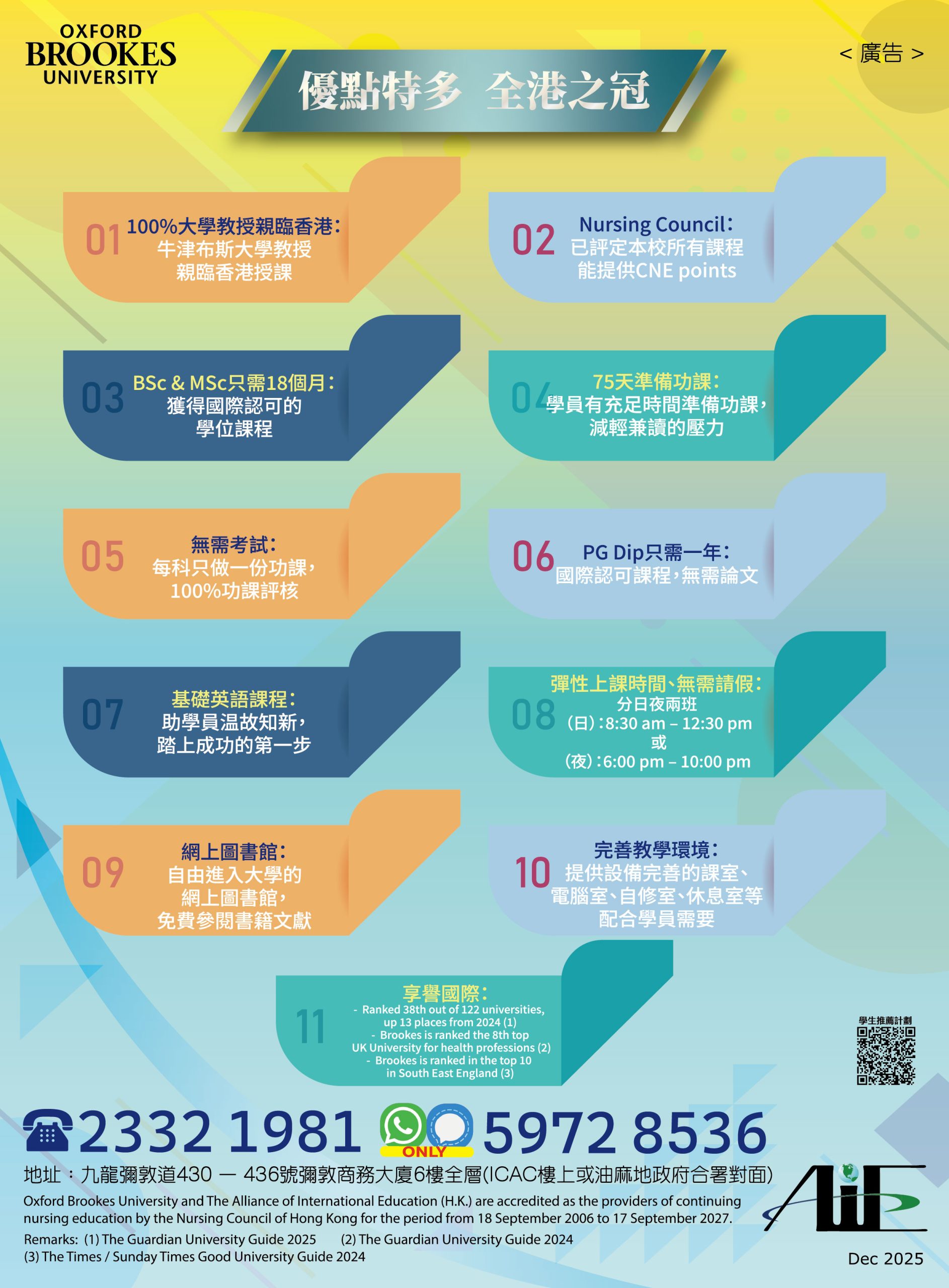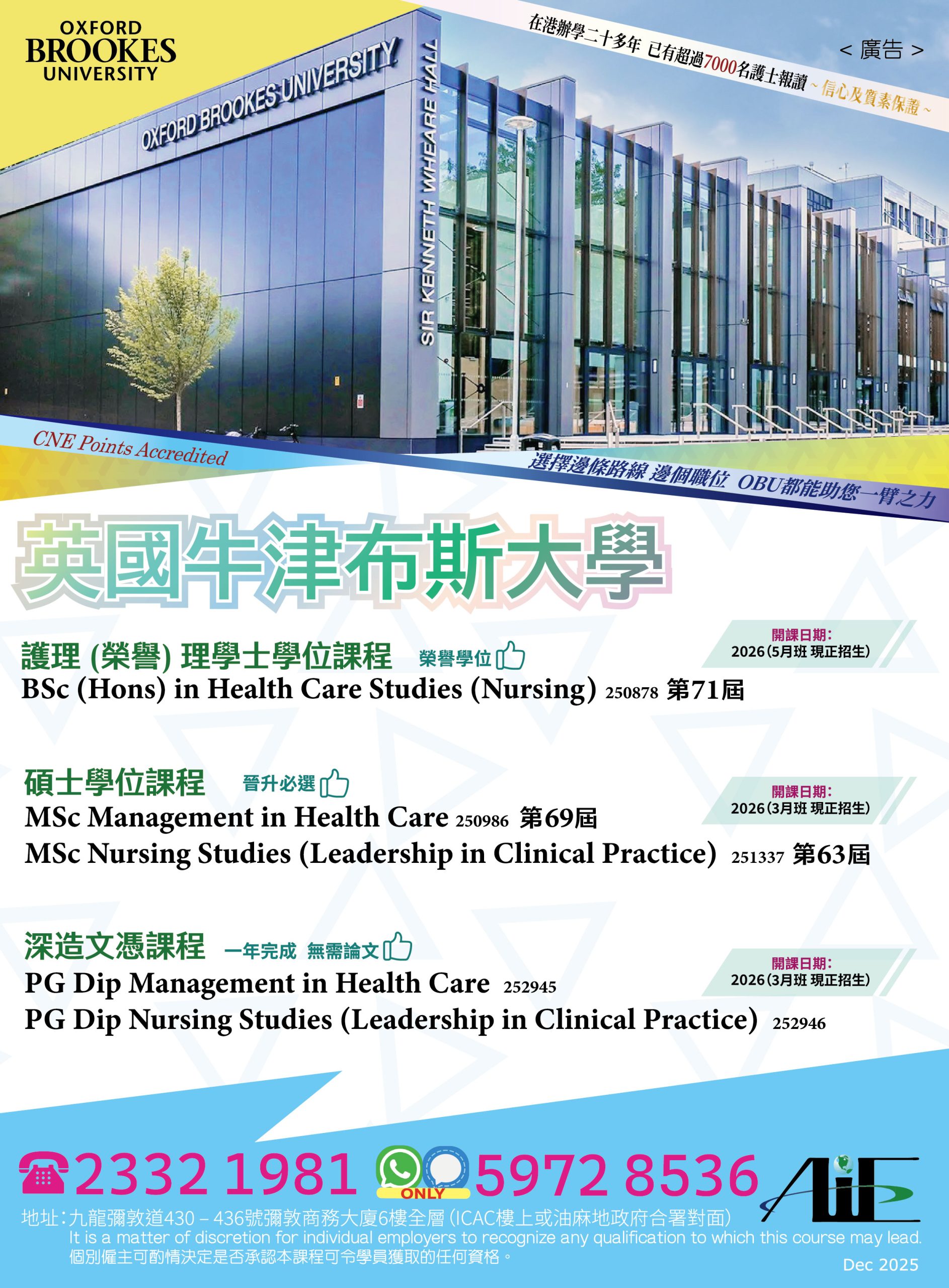News and Events News and Events News and Events 護理〈榮譽〉理學士學位課程 BSc (Hons) in Health Care Studies (Nursing)* (Reg. no. 250878) – May 2026 Intake (Register Now!!!) May 2026 Intake 碩士學位課程 MSc Management in Health Care* (Reg. no. 250986) / MSc Nursing Studies (Leadership in Clinical Practice)* (Reg. no. 251337) – March 2026 Intake (Register Now!!!) March 2026 Intake 深造文憑課程 Pg Dip Management in Health Care* (Reg. no. 252945) / Pg Dip Nursing Studies (Leadership in Clinical Practice)* (Reg. no. 252946) – March 2026 Intake (Register Now!!!) March 2026 Intake It is a matter of discretion for individual employers to recognize any qualification to which this course may lead.
