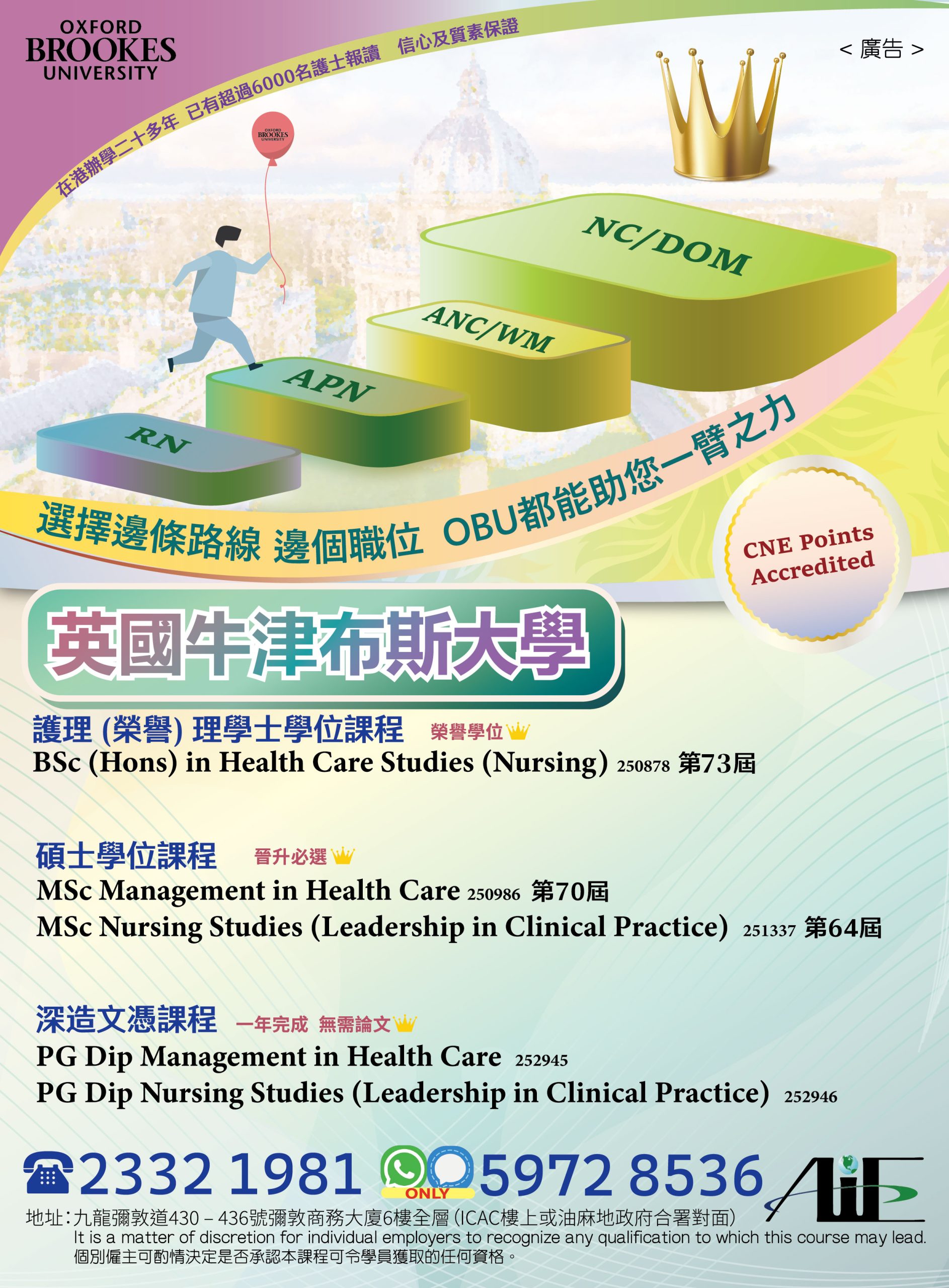 News and Events News and Events News and Events 護理〈榮譽〉理學士學位課程 BSc (Hons) in Health Care Studies (Nursing)* (Reg. no. 250878) – January 2027 Intake (Applications Opening Soon) January 2027 Intake 碩士學位課程 MSc Management in Health Care* (Reg. no. 250986) / MSc Nursing Studies (Leadership in Clinical Practice)* (Reg. no. 251337) – July 2026 Intake (Register Now!!!) July 2026 Intake 深造文憑課程 Pg Dip Management in Health Care* (Reg. no. 252945) / Pg Dip Nursing Studies (Leadership in Clinical Practice)* (Reg. no. 252946) – July 2026 Intake (Register Now!!!) July 2026 Intake It is a matter of discretion for individual employers to recognize any qualification to which this course may lead.